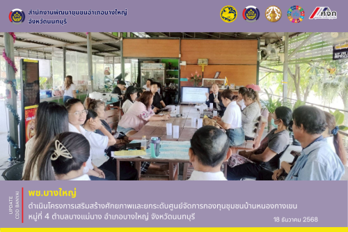 นายอำพรชัย วิชิตพรชัย พัฒนาการอำเภอบางใหญ่ พร้อมด้วยเจ้าหน้าที่สำนักงานพัฒนาชุมชนอำเภอบางใหญ่ดำเนินโครงการเสริมสร้างศักยภาพและยกระดับศูนย์จัดการกองทุนชุมชนบ้านหนองกางเขน หมู่ที่ 4 ตำบลบางแม่นาง อำเภอบางใหญ่ จังหวัดนนทบุรี เพื่อส่งเสริมให้คณะกรรมการศูนย์จัดการกองทุนชุมชนมีความรู้ ความเข้าใจในเรื่องการบริหารจัดการกองทุนชุมชน โดยกิจกรรมเป็นการอบรมให้ความรู้เกี่ยวกับแนวทางการขับเคลื่อนศูนย์จัดการกองทุนชุมชน ทบทวนบทบาทภารกิจของคณะกรรมการศูนย์จัดการกองทุนชุมชน การประเมินผลการจัดระดับศูนย์จัดการกองทุนชุมชน รวมทั้งจัดทำแผนพัฒนาและกำหนดทิศทางการขับเคลื่อนศูนย์จัดการกองทุนชุมชนให้สอดคล้องตามผลการประเมินการจัดระดับศูนย์จัดการกองทุนชุมชน